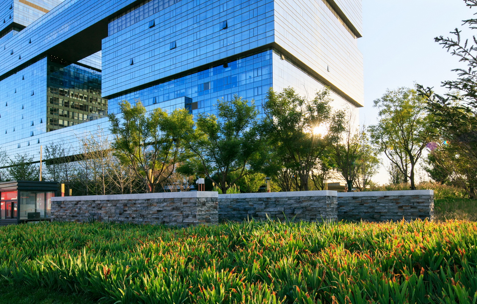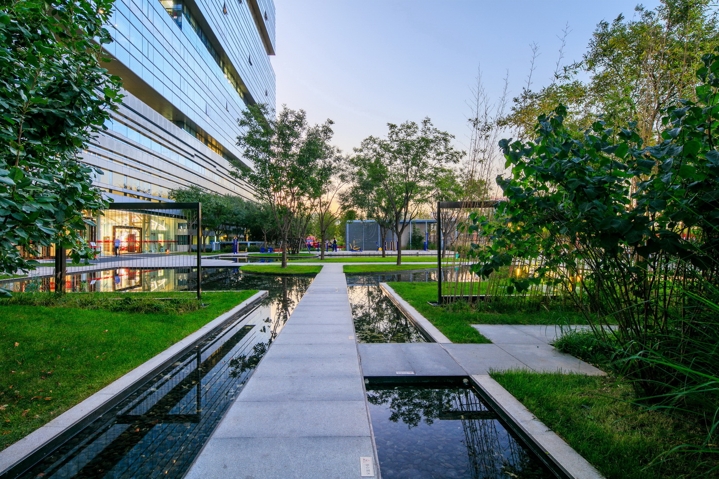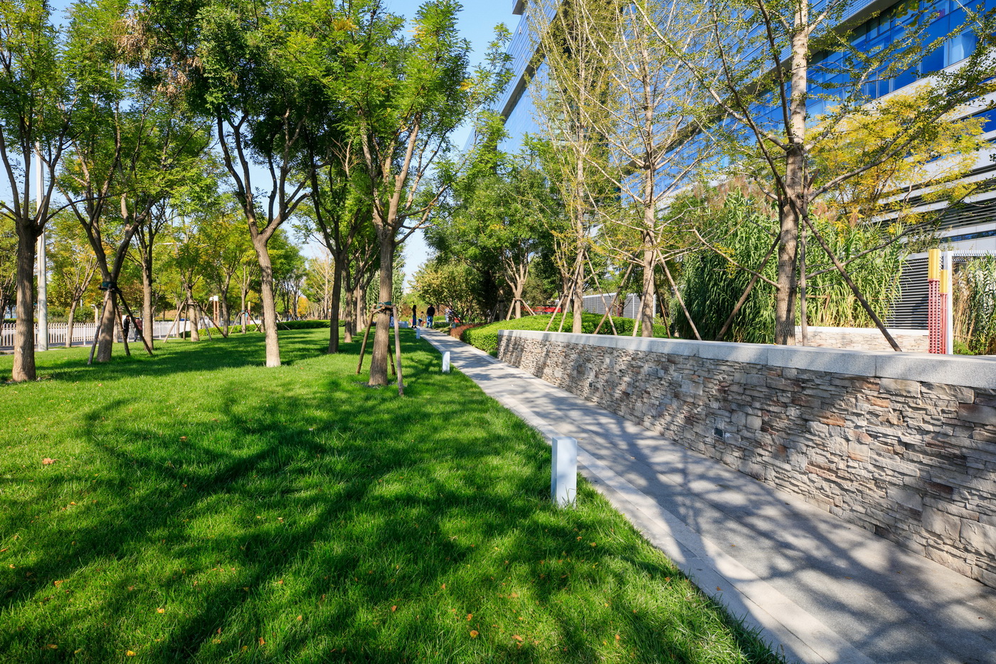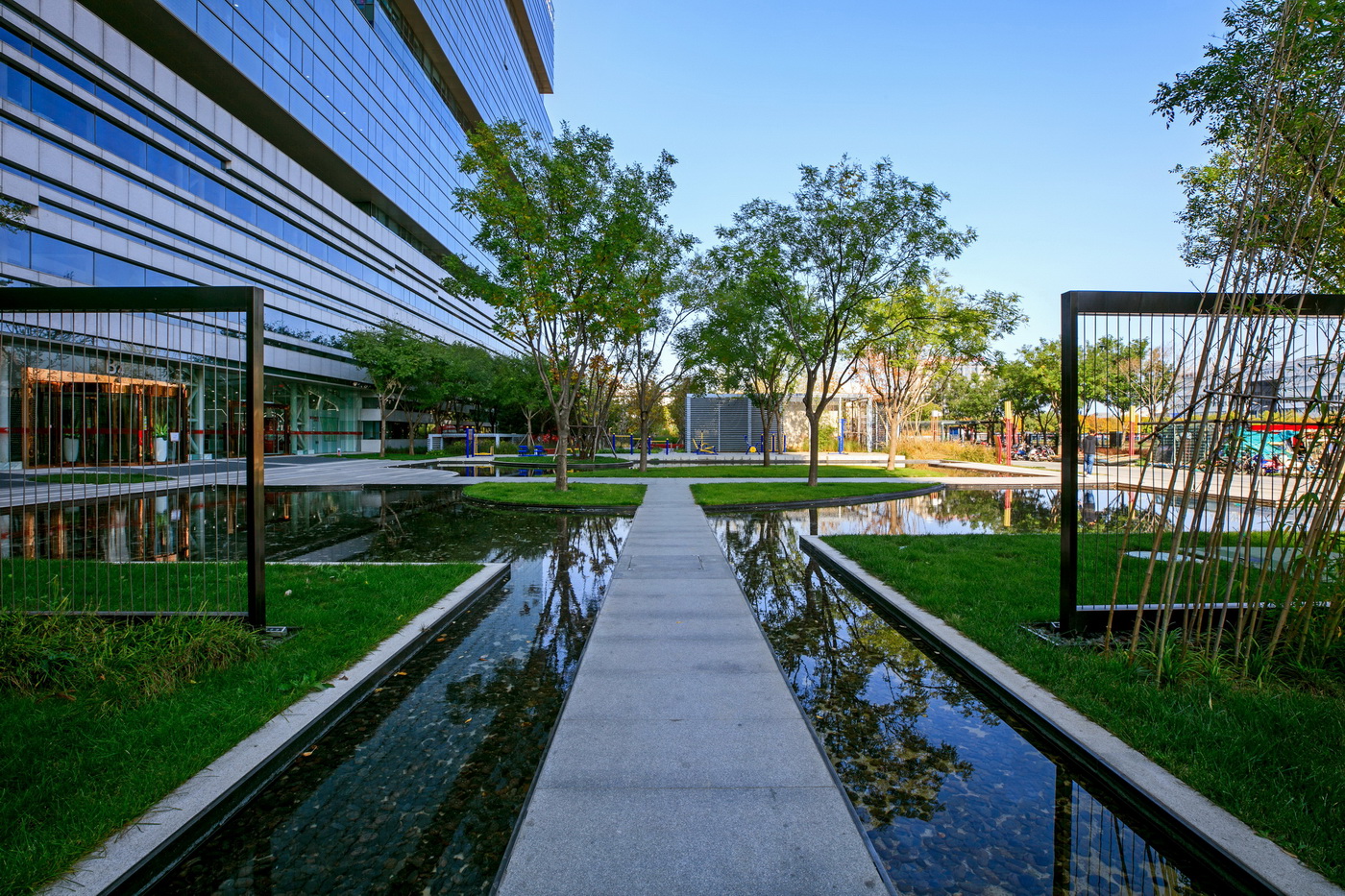 北京京东集团总部为京东集团总部办公楼,项目应用野草、整石等营造野趣又简约大气的办公空间。项目工程采用了新工艺—不锈钢钢丝影壁,其边框为碳化拉丝不锈钢。影壁施工中多次与设计甲方沟通,实地做样板,为了更好的营造景观,最后将原来的亚克力板改为不锈钢钢丝绳。以片植竹子为背景的影壁在阳光或灯光照射下效果极富意境。在办公人员休息活动区域,具有项目特色的红菠萝格木椅,点缀飘逸的观赏草,既是休息之处亦是观赏之景,充满意趣。