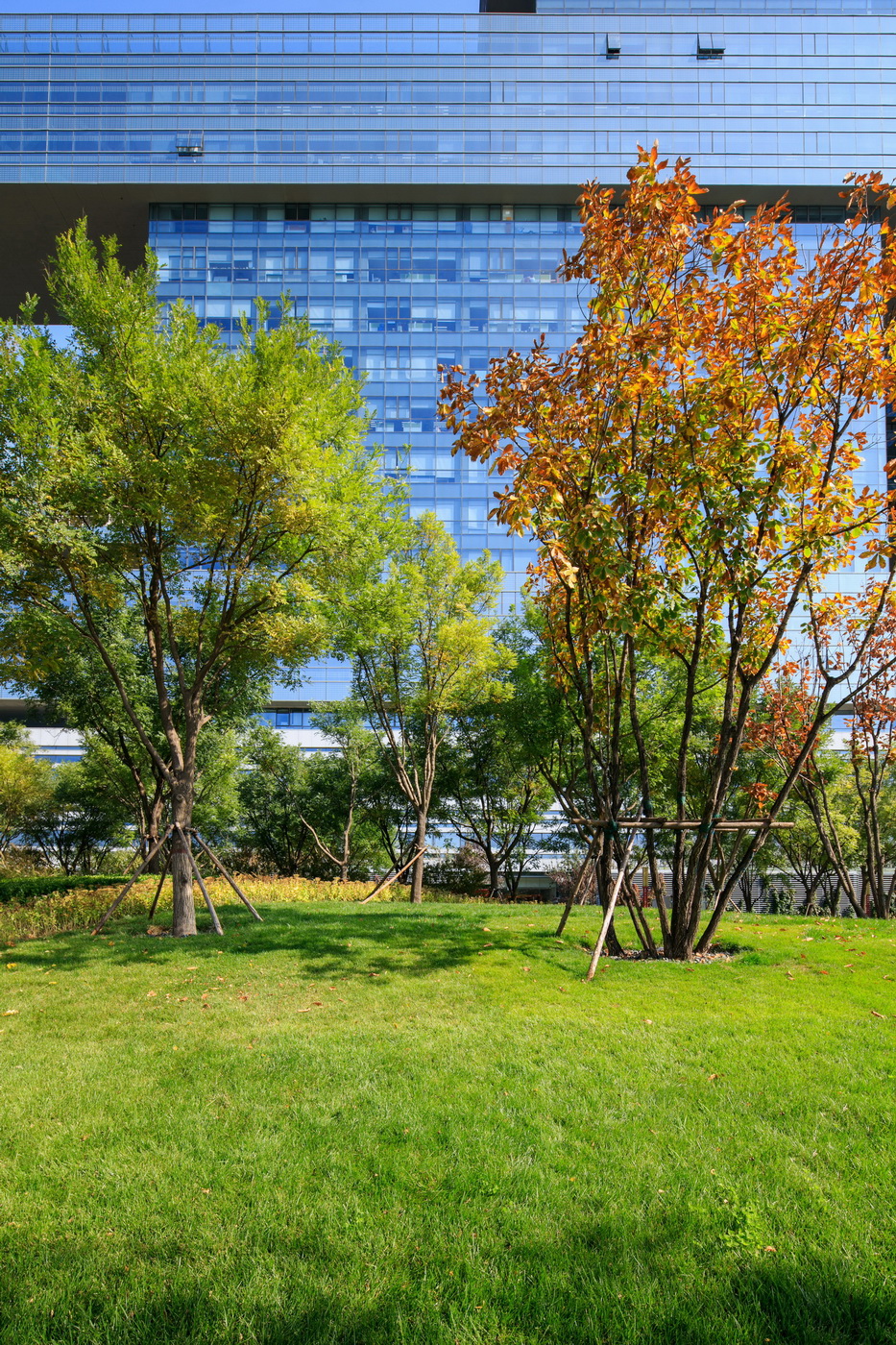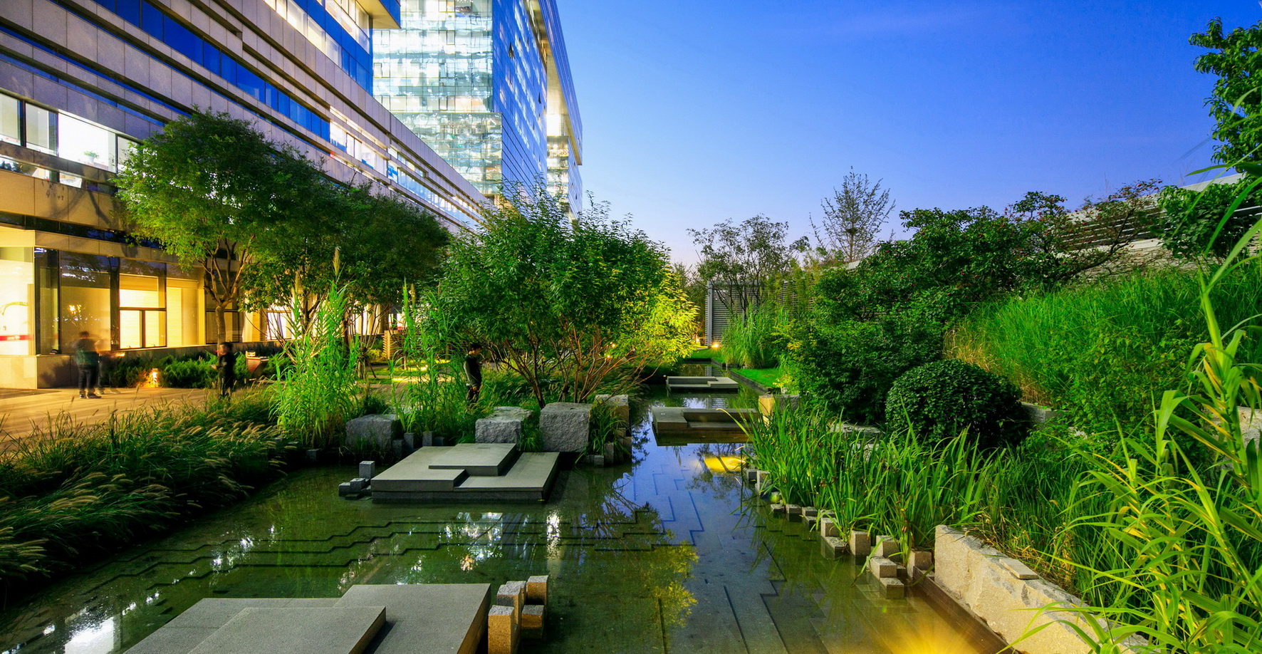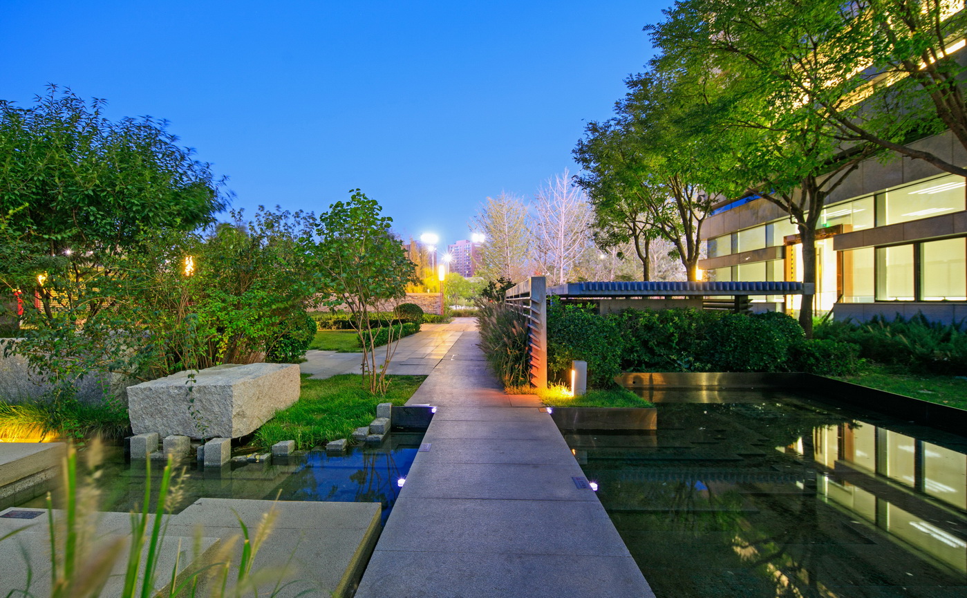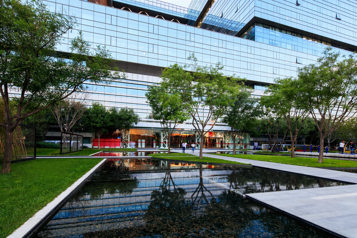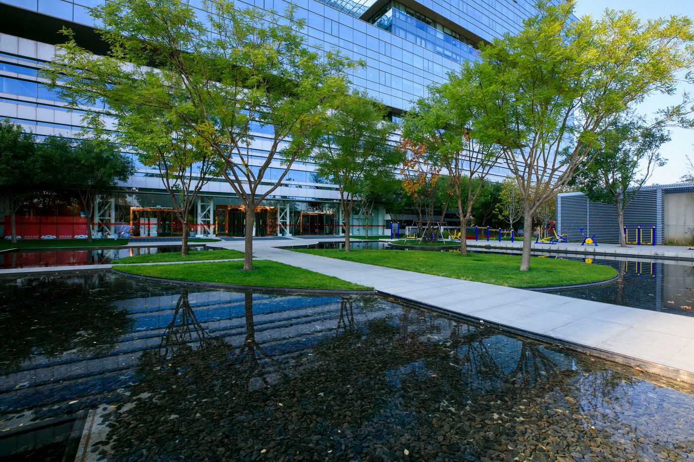 北京京东集团总部为京东集团总部办公楼,项目应用野草、整石等营造野趣又简约大气的办公空间。项目工程采用了新工艺—不锈钢钢丝影壁,其边框为碳化拉丝不锈钢。影壁施工中多次与设计甲方沟通,实地做样板,为了更好的营造景观,最后将原来的亚克力板改为不锈钢钢丝绳。以片植竹子为背景的影壁在阳光或灯光照射下效果极富意境。在办公人员休息活动区域,具有项目特色的红菠萝格木椅,点缀飘逸的观赏草,既是休息之处亦是观赏之景,充满意趣。