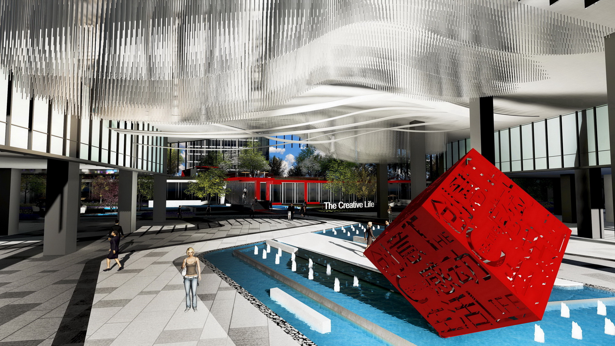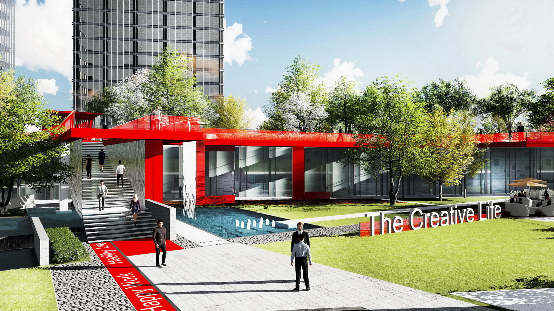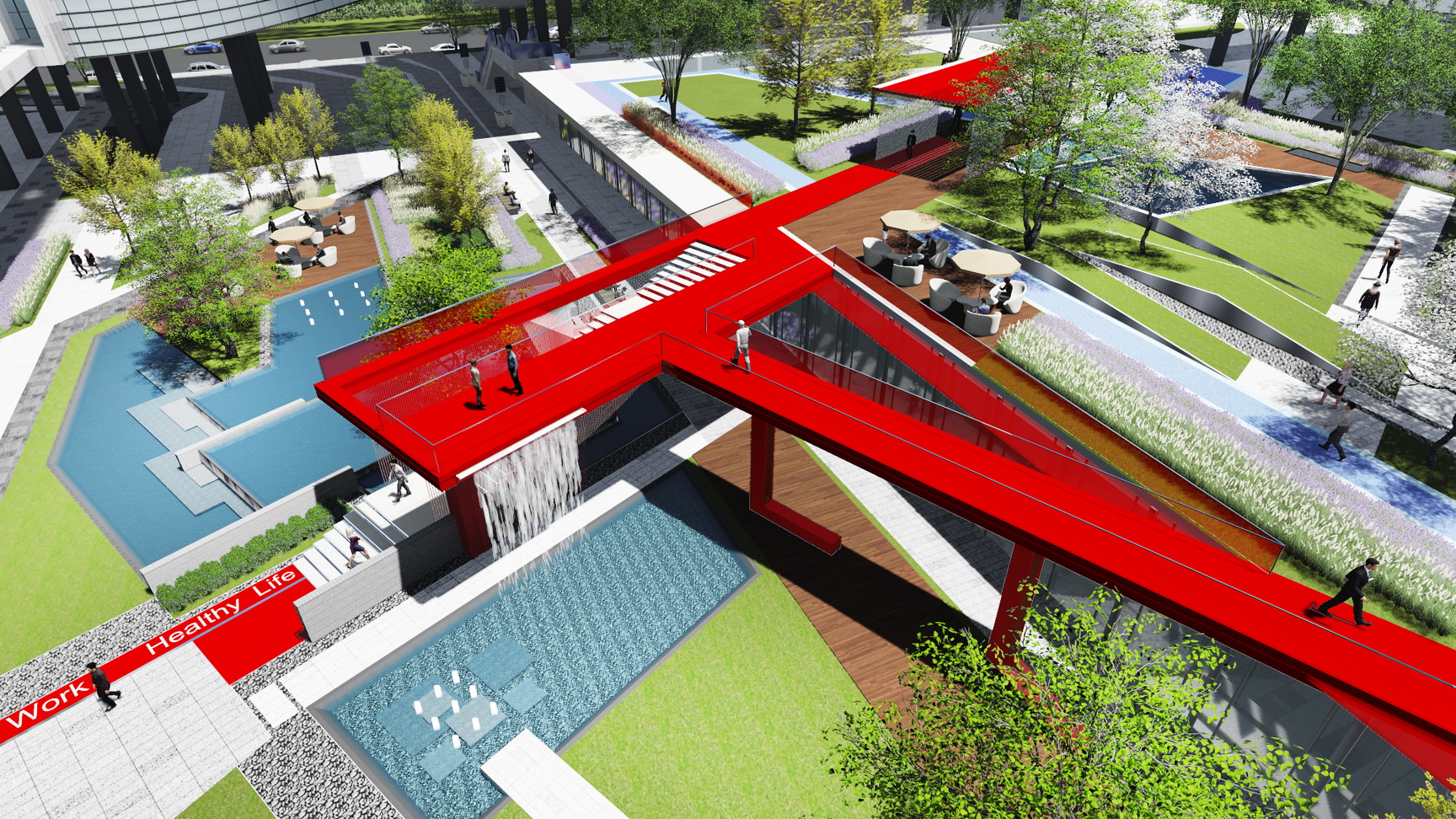 项目为高新科技园区,设计从商业、办公、居住一体化出发,让绿色联动生活。通过景观带动商业,景观为商业和办公客户服务,使建筑、景观、商业、人有机地融为一体。通过三维的、立体的、自由飘逸的立体空间网络有效整合不同人群的活动需求,营造出更加便捷的工作流线,更加简约的基础设施,更加活跃的共享平台。同时不局限于传统园林范畴的感受和体验,打造可视化的多媒体景观,极富互动性的开放空间,让艺术、教育和公共媒体在此交汇、相融,从而使之跃升成为一个面向未来的项目。