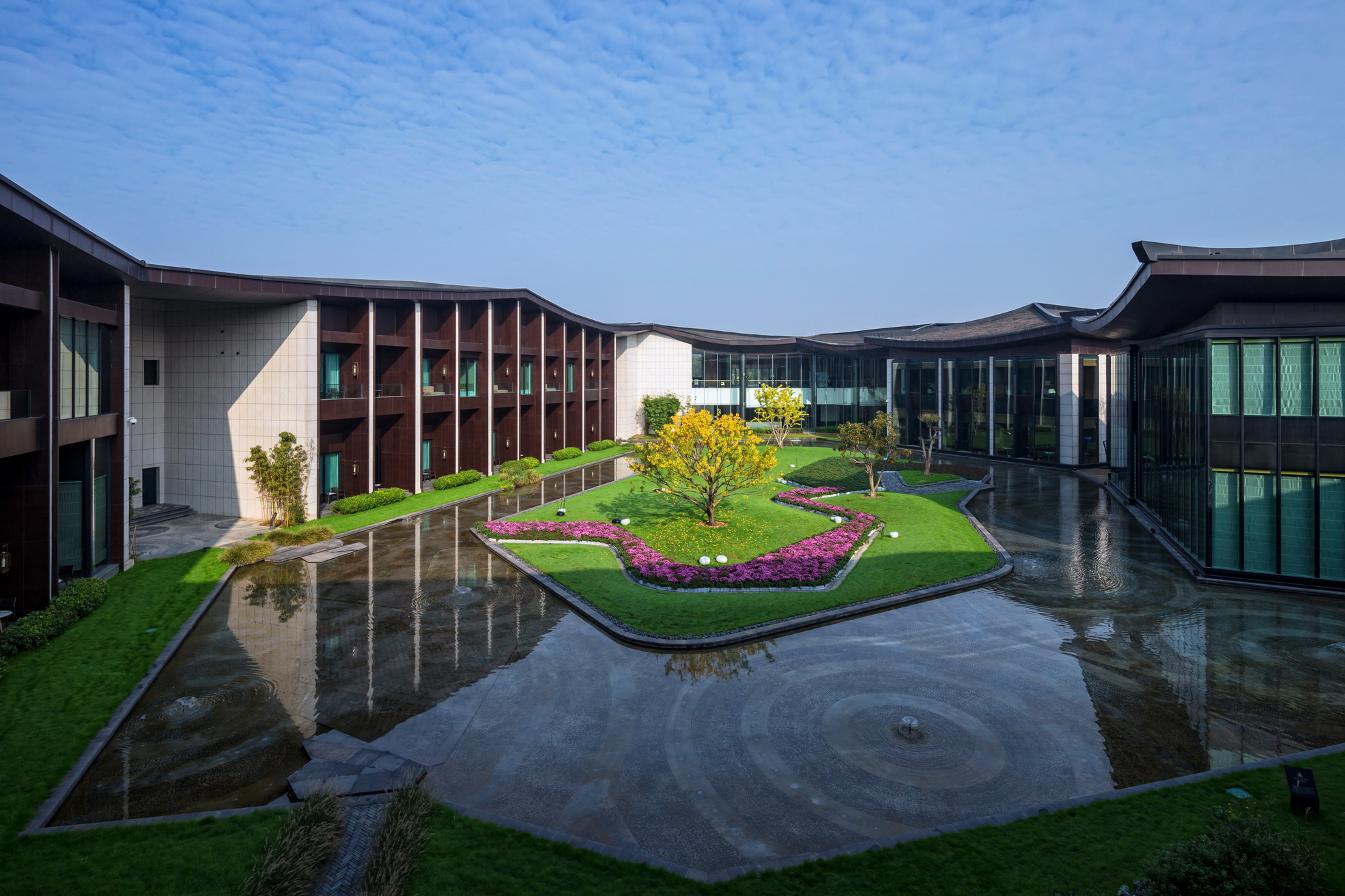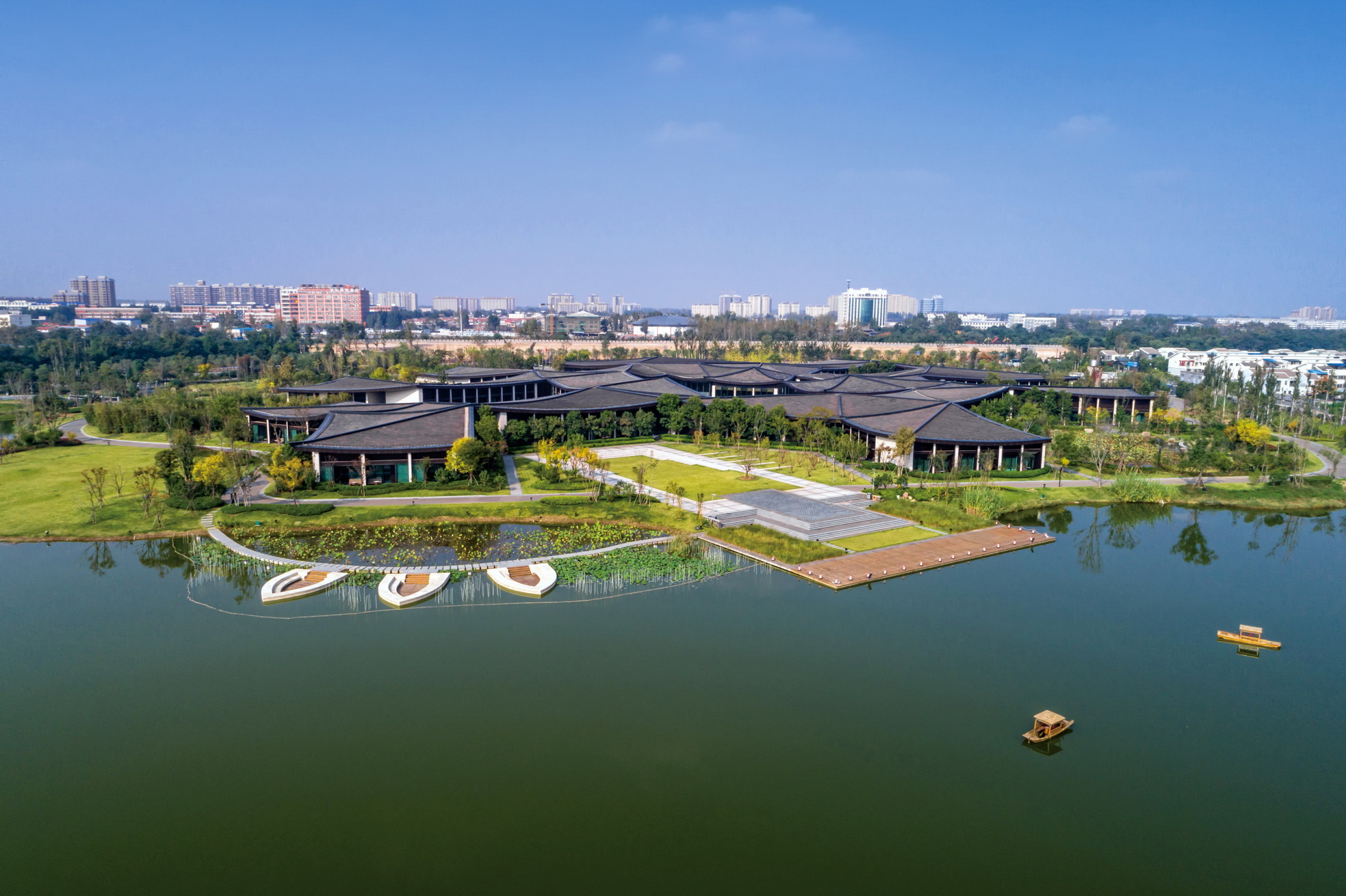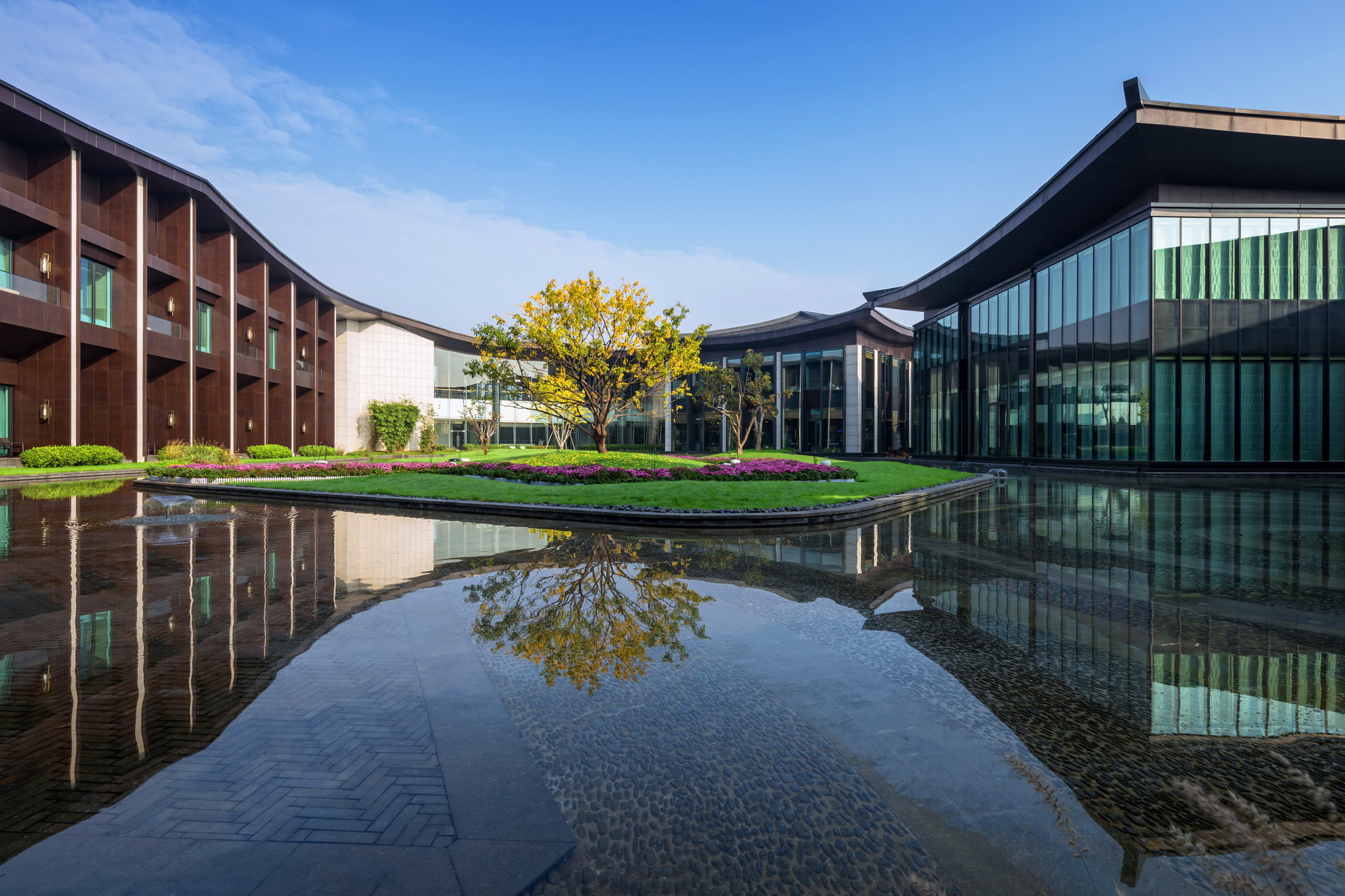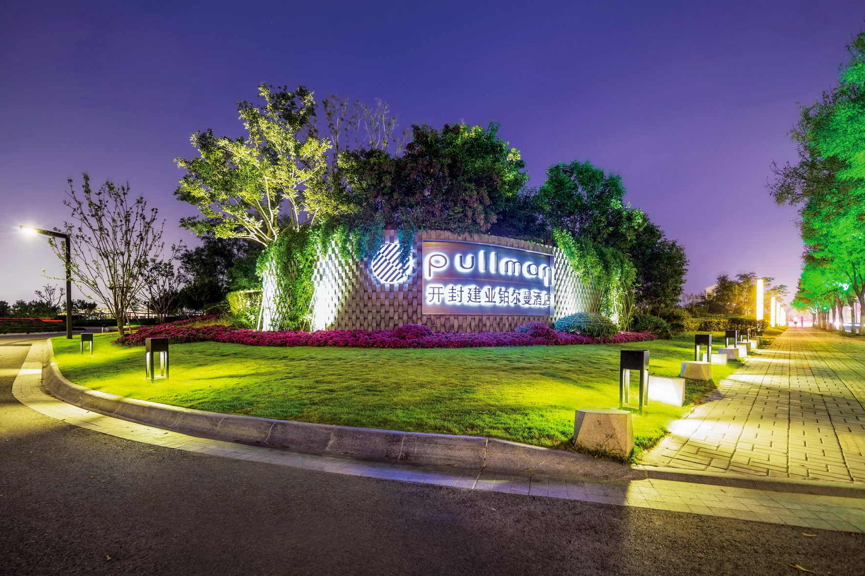 开封建业铂尔曼酒店坐落于北宋古都开封古城墙内,毗邻著名景点清明上河园。项目延续开封水文化,以院落与坡屋面为主题,将"水院"思路贯串设计始终,倾力打造新时期"宋韵"文化背景下的主题酒店。景观打造从中国传统的建筑理念与现代设计风格入手,以古城为背景,将交错的湖泊与精致的花园相结合,营造自然景观与人文景观和谐统一的主题生态度假酒店,再现开封六朝古都的历史人文风采。