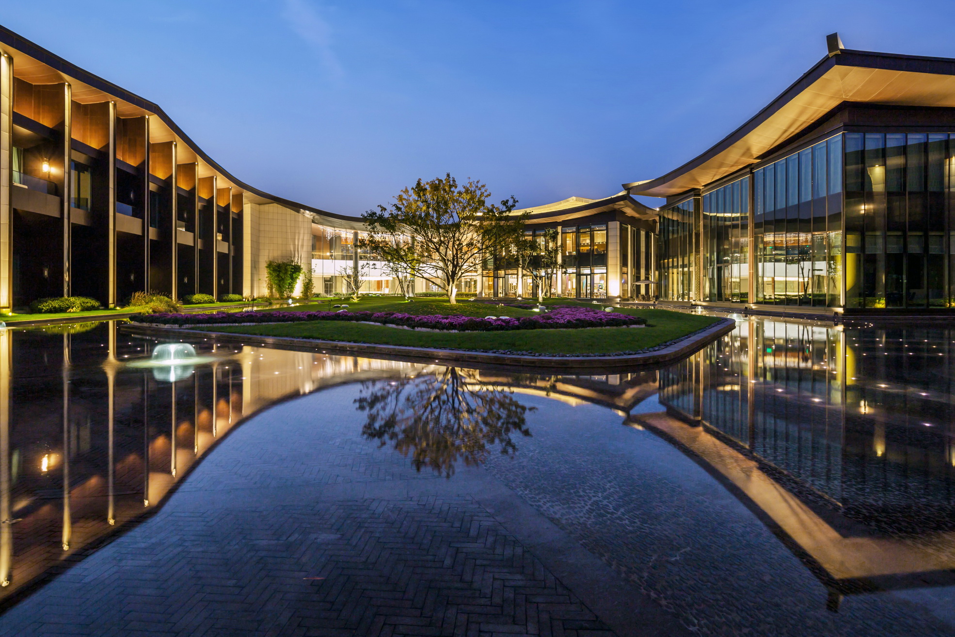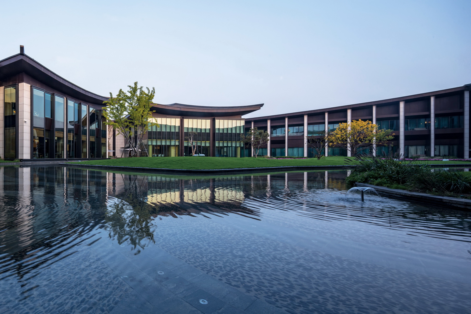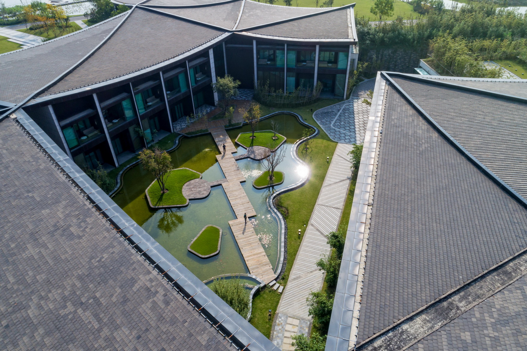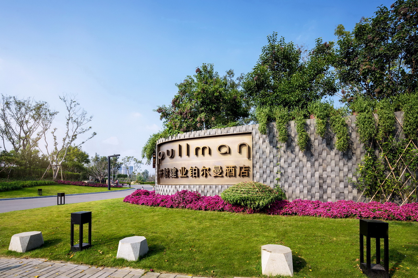 开封建业铂尔曼酒店坐落于北宋古都开封古城墙内,毗邻著名景点清明上河园。项目延续开封水文化,以院落与坡屋面为主题,将"水院"思路贯串设计始终,倾力打造新时期"宋韵"文化背景下的主题酒店。景观打造从中国传统的建筑理念与现代设计风格入手,以古城为背景,将交错的湖泊与精致的花园相结合,营造自然景观与人文景观和谐统一的主题生态度假酒店,再现开封六朝古都的历史人文风采。