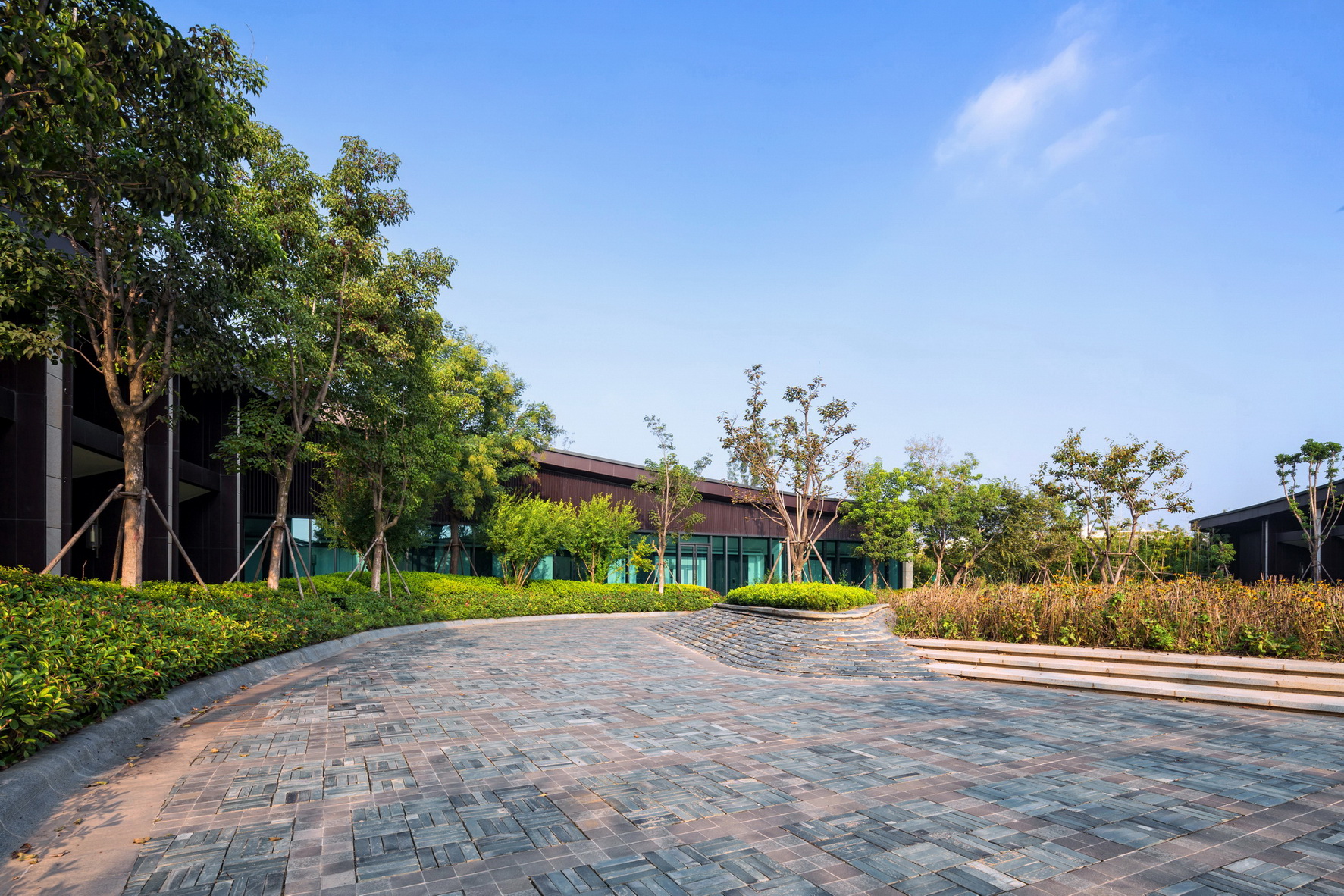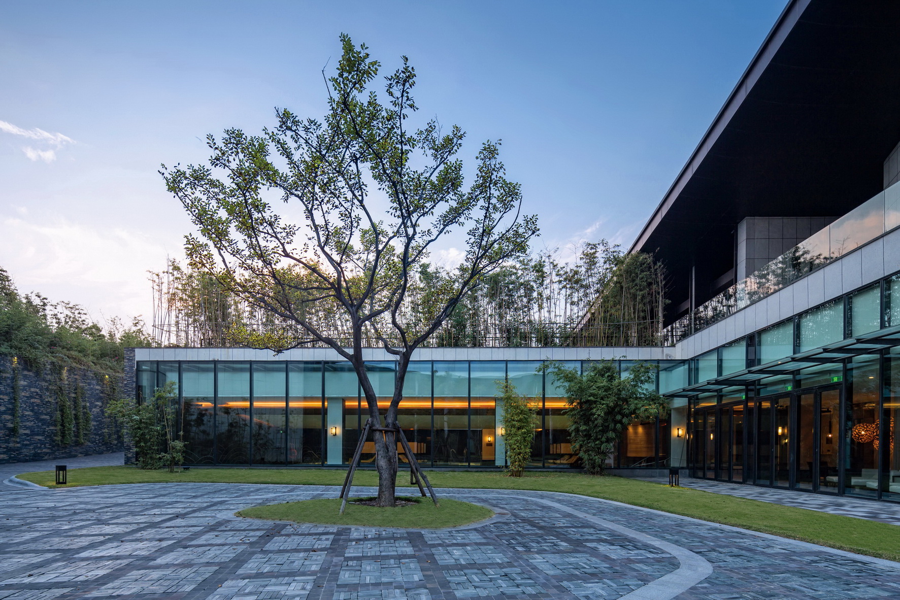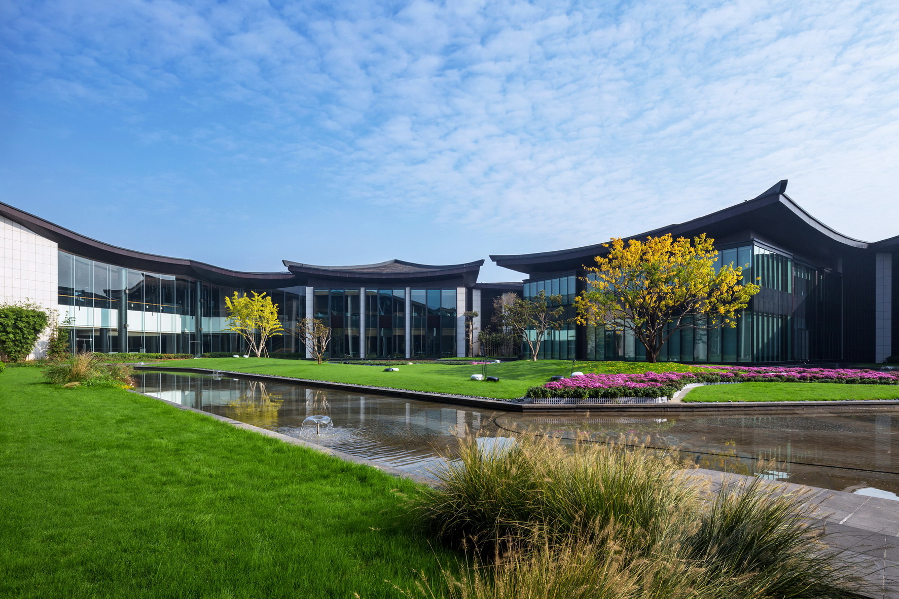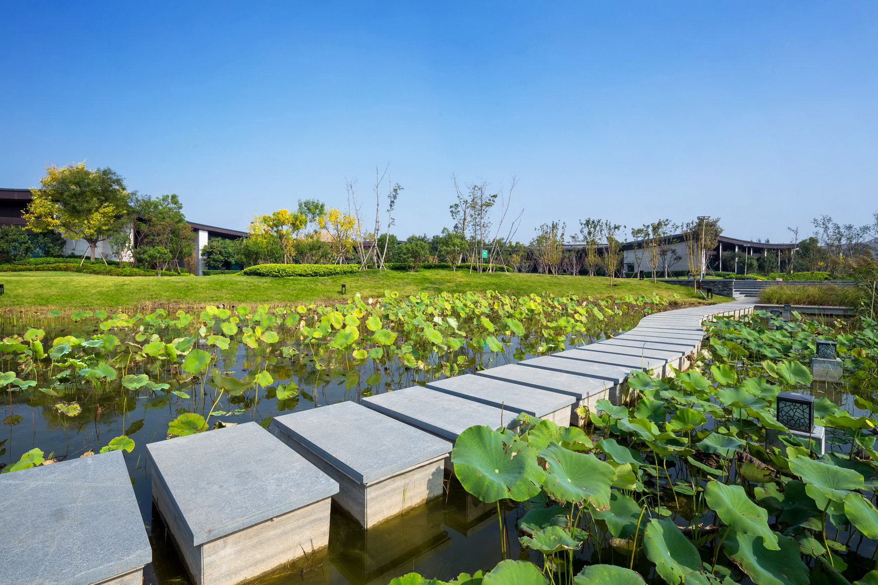 开封建业铂尔曼酒店坐落于北宋古都开封古城墙内,毗邻著名景点清明上河园。项目延续开封水文化,以院落与坡屋面为主题,将"水院"思路贯串设计始终,倾力打造新时期"宋韵"文化背景下的主题酒店。景观打造从中国传统的建筑理念与现代设计风格入手,以古城为背景,将交错的湖泊与精致的花园相结合,营造自然景观与人文景观和谐统一的主题生态度假酒店,再现开封六朝古都的历史人文风采。