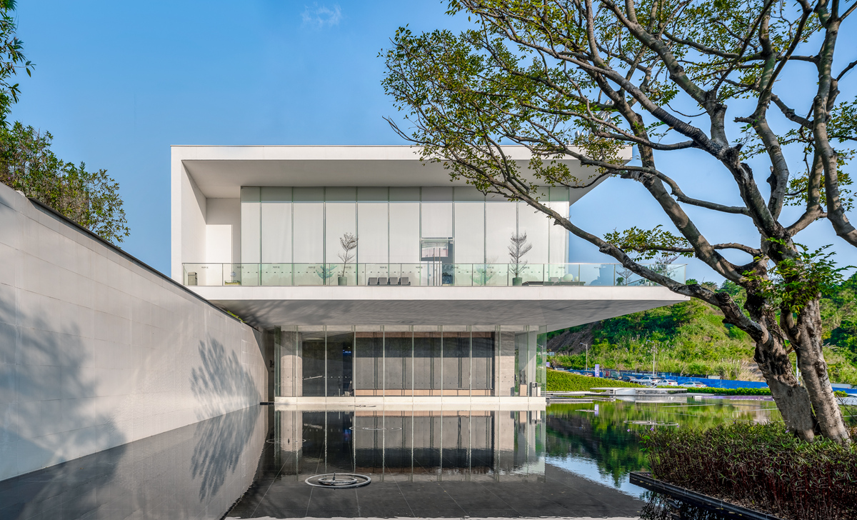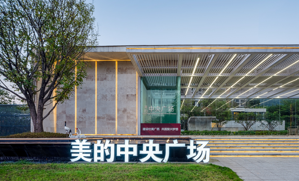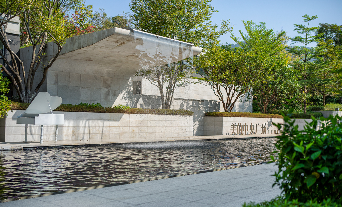 梧州美的中央广场摒弃了复杂的外在装饰,以一面白墙、一波碧水、一个涟漪、一叶扁舟营境,打造城市展厅独特美感。项目重视对场所的思考,构建和重塑着自然与人之间的角色关系,以少许胜繁复,将景观与自然环境、属地文化高度融合,为居住者带来“烟波浩渺,满幅皆水”的景观体验。