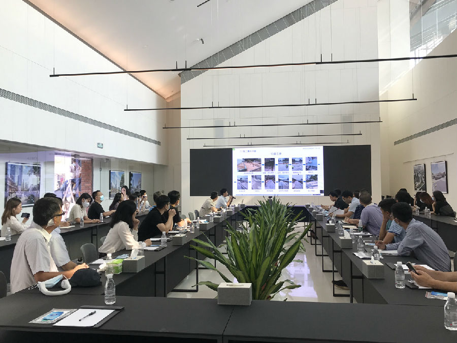 “白鹅潭聚龙湾展示区”项目由广州珠江产业园投资发展有限公司投资建设,由SASAKI进行园林景观方案设计,我司进行园林景观深化设计与施工。会上,与会者首先参观项目现场并了解新工艺的使用情况、新材料应用的效果。该项目整体质量效果得到了与会者的肯定和赞许,引起了各单位的学习热潮。随后,投资建设方广州珠江产业园投资发展有限公司景观设计总监王弛翔先生介绍了项目的基本情况,SASAKI公司代表介绍了设计方案与理念,该方案主要以本地的旧材料进行二次利用,运用环保手法突出旧城市新面貌的概念进行设计。我司代表高文志先生介绍了“白鹅潭聚龙湾展示中心——现场浇筑酸洗混凝土工艺专项报告”,重点详述了现场浇筑酸洗混凝土的重要关键点和技术难点,包括10道施工工序、9大重要关键技术点、8大施工重点难点及对策。在不利的外部环境条件下,我司工程技术人员有效控制了高标号彩色混凝土的着色和塑形技术,并达到良好艺术效果。最后,广州市住房和城乡建设局领导提出完善建议:一是希望建设单位能继续做好项目精细化管理,广州能持续推出精品项目;二是希望效果好的新工艺、新材料持续得到推广与应用;三是希望建设单位、设计单位等做好优秀项目的经验总结并推广。