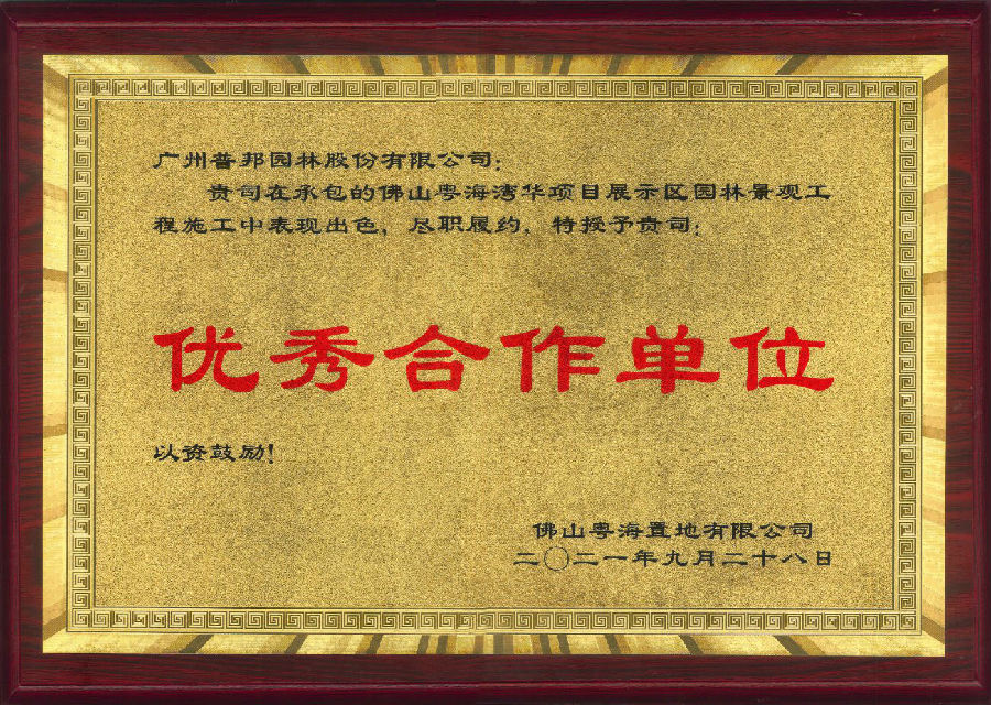9月28日,在佛山粤海置地有限公司举行的“佛山湾华项目展示区”总结复盘会上,我司凭借该项目园林景观施工的优异成绩,赢得客户高度认可,荣获“优秀合作单位”称号。
