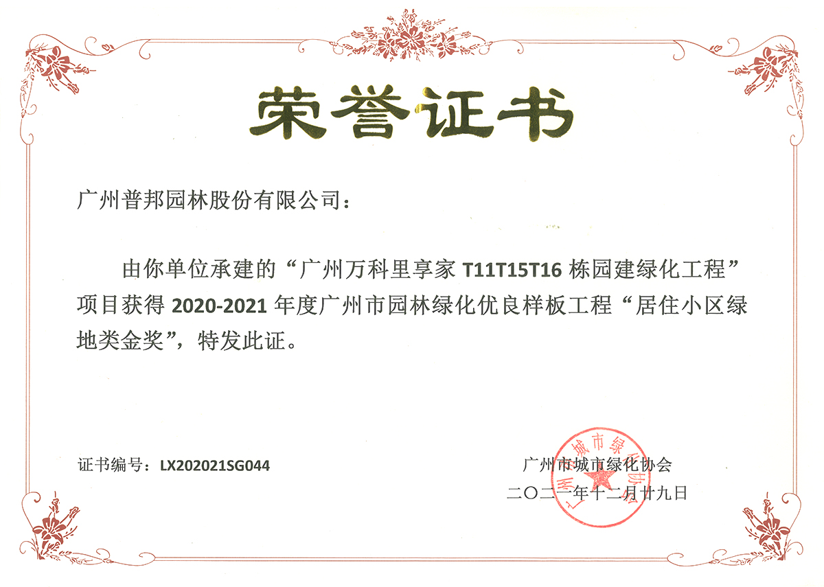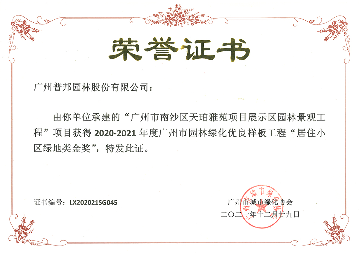 近日,由广州市城市绿化协会主办的2021年广州市“园林绿化优良样板工程(含绿化养护优良样板工程)”评选活动落下帷幕,我司参评的2个工程项目均荣获2020-2021年度广州市园林绿化优良样板工程“居住小区绿地类金奖”,获奖项目分别为“广州万科里享家T11T15T16栋园建绿化工程”和“广州市南沙区天珀雅苑项目展示区园林景观工程”。