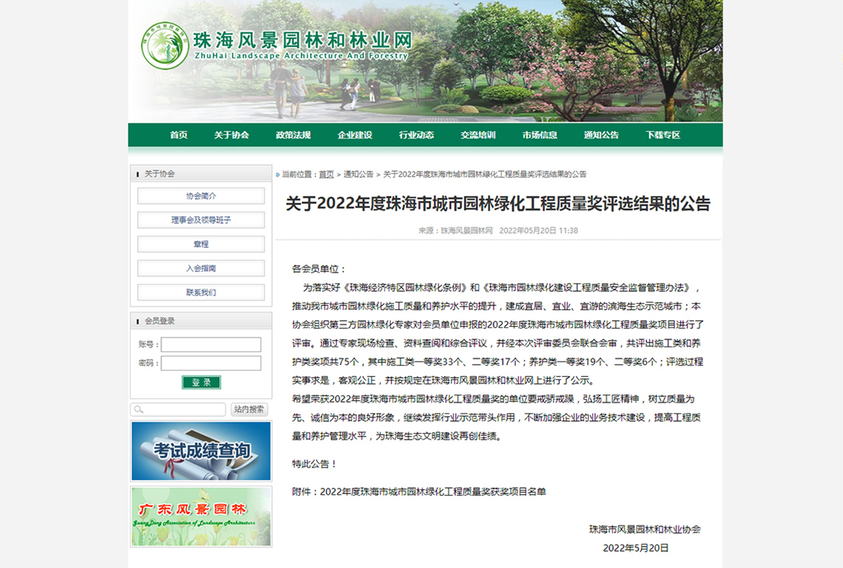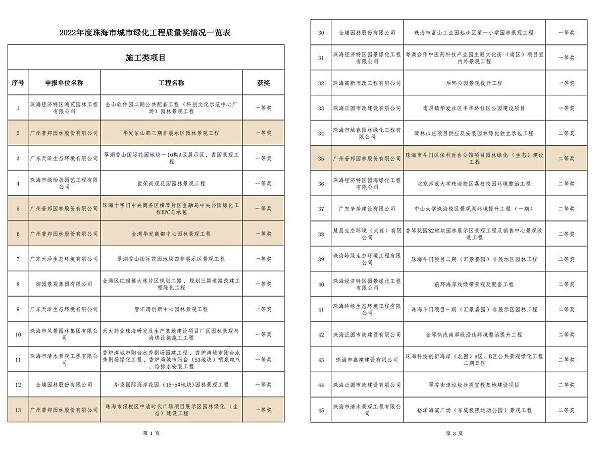 近日,由珠海市风景园林和林业协会主办的“2022年度珠海市城市园林绿化工程质量奖”评选活动落下帷幕。我司送审参评的5个工程项目,全部获奖。其中,“华发依山郡三期非展示区园林景观工程”、“珠海十字门中央商务区横琴片区金融岛中央公园绿化工程EPC总承包”、“金湾华发商都中心园林景观工程”、“珠海市保税区中油时代广场项目展示区园林绿化(生态)建设工程”均荣获一等奖,“珠海市斗门区保利百合公馆项目园林绿化(生态)建设工程”获二等奖。
