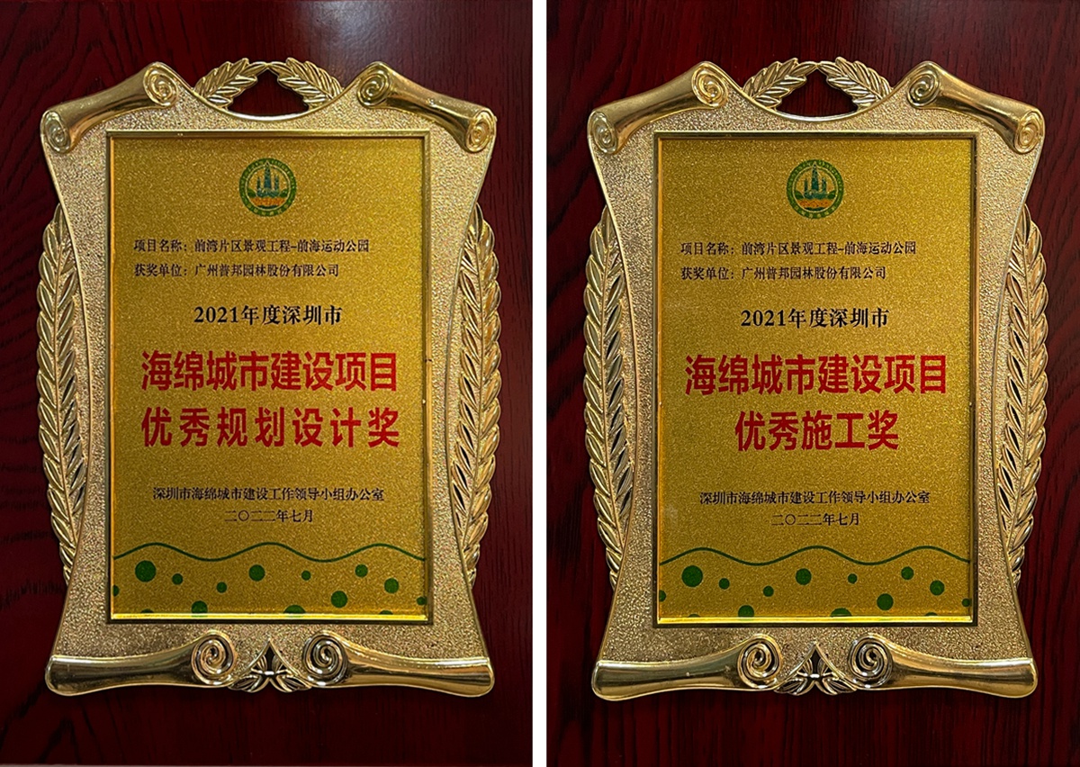 近日,深圳市海绵城市建设工作领导小组办公室为2021年度深圳市海绵城市建设优秀项目颁发奖牌及荣誉证书。由我司设计施工一体化打造的前湾片区景观工程——前海运动公园荣获2021年度深圳市海绵城市建设项目优秀规划设计奖二等奖和优秀施工奖三等奖。