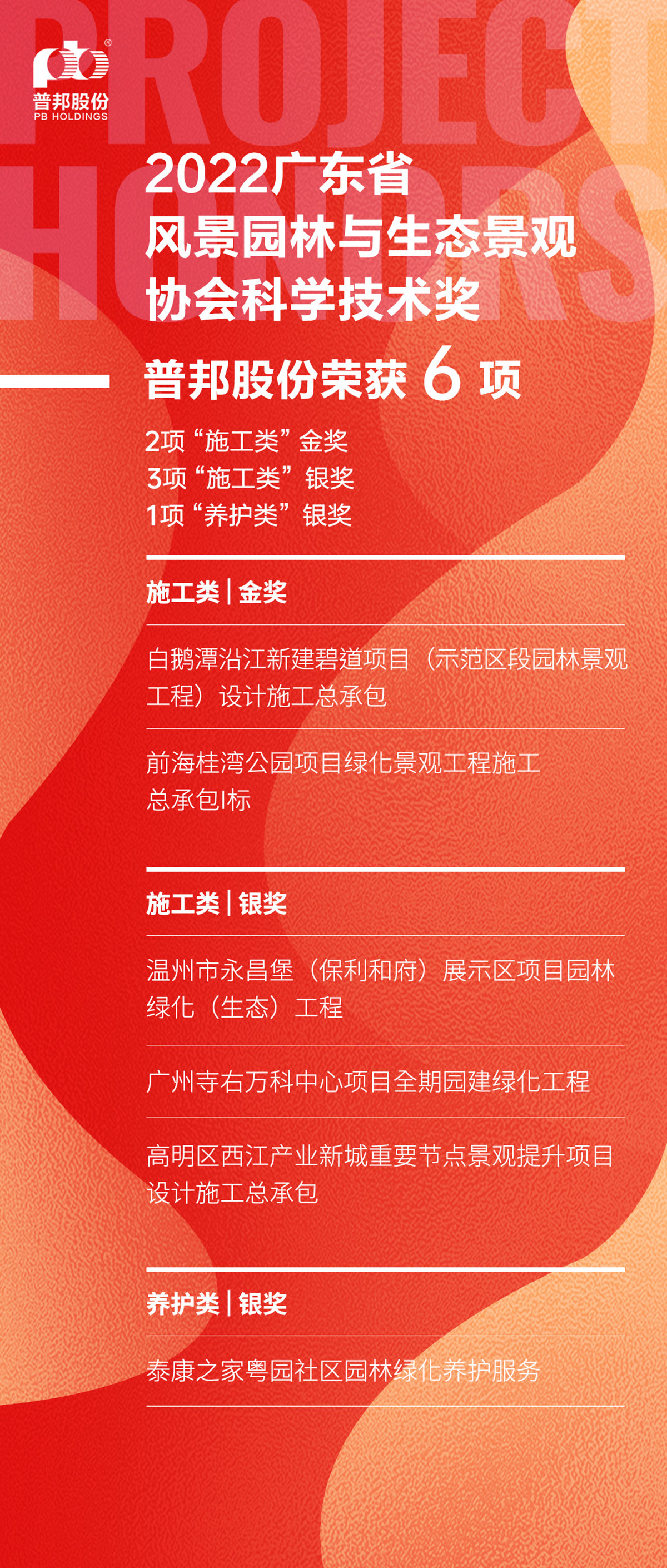近日,广东省风景园林与生态景观协会(简称“省风协”)公布了2022年度广东省风景园林与生态景观协会科学技术奖(园林工程奖)获奖名单。我司斩获6项大奖,包括施工类金奖2项、施工类银奖3项、养护类银奖1项。