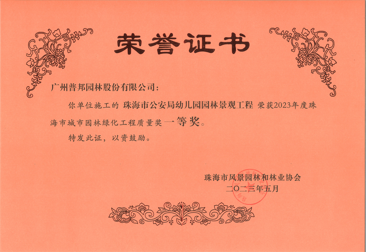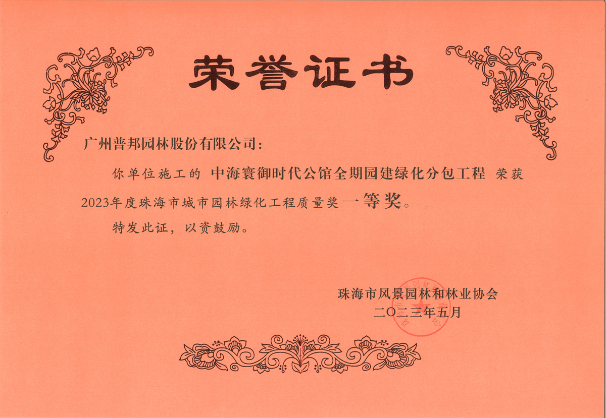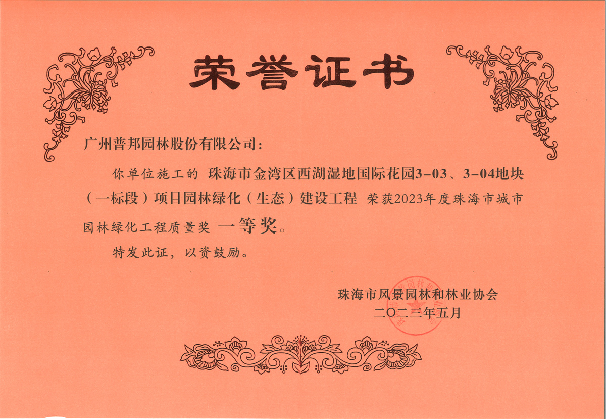 珠海市城市园林绿化工程质量奖评选活动主要评选在全市具有引导和示范作用的园林绿化优秀工程,旨在提高珠海市城市园林绿化工程建设质量和水平。该奖项是珠海市园林绿化工程的最高奖项,设一、二、三等奖。我司参评的3个项目荣获一等奖,是珠海市园林行业协会对我司工程项目精湛品质的高度认可。