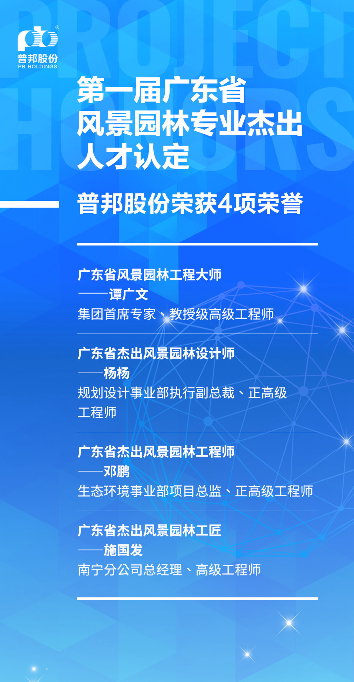 我司共有4位专家入围,成为获认定人数最多的会员单位。集团首席专家、园林教授级高级工程师谭广文获评“广东省风景园林工程大师”;规划设计事业部执行副总裁、正高级工程师杨杨获评“广东省杰出风景园林设计师”;生态环境事业部项目总监、正高级工程师邓鹏获评“广东省杰出风景园林工程师”;南宁分公司总经理、高级工程师施国发获评“广东省杰出风景园林工匠”。