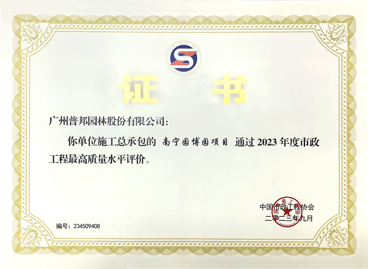 近日,由中国市政工程协会主办的2023年度市政工程最高质量水平评价工程评选活动落下帷幕,由我司施工总承包的“南宁园博园项目”通过“2023年度市政工程最高质量水平评价”。