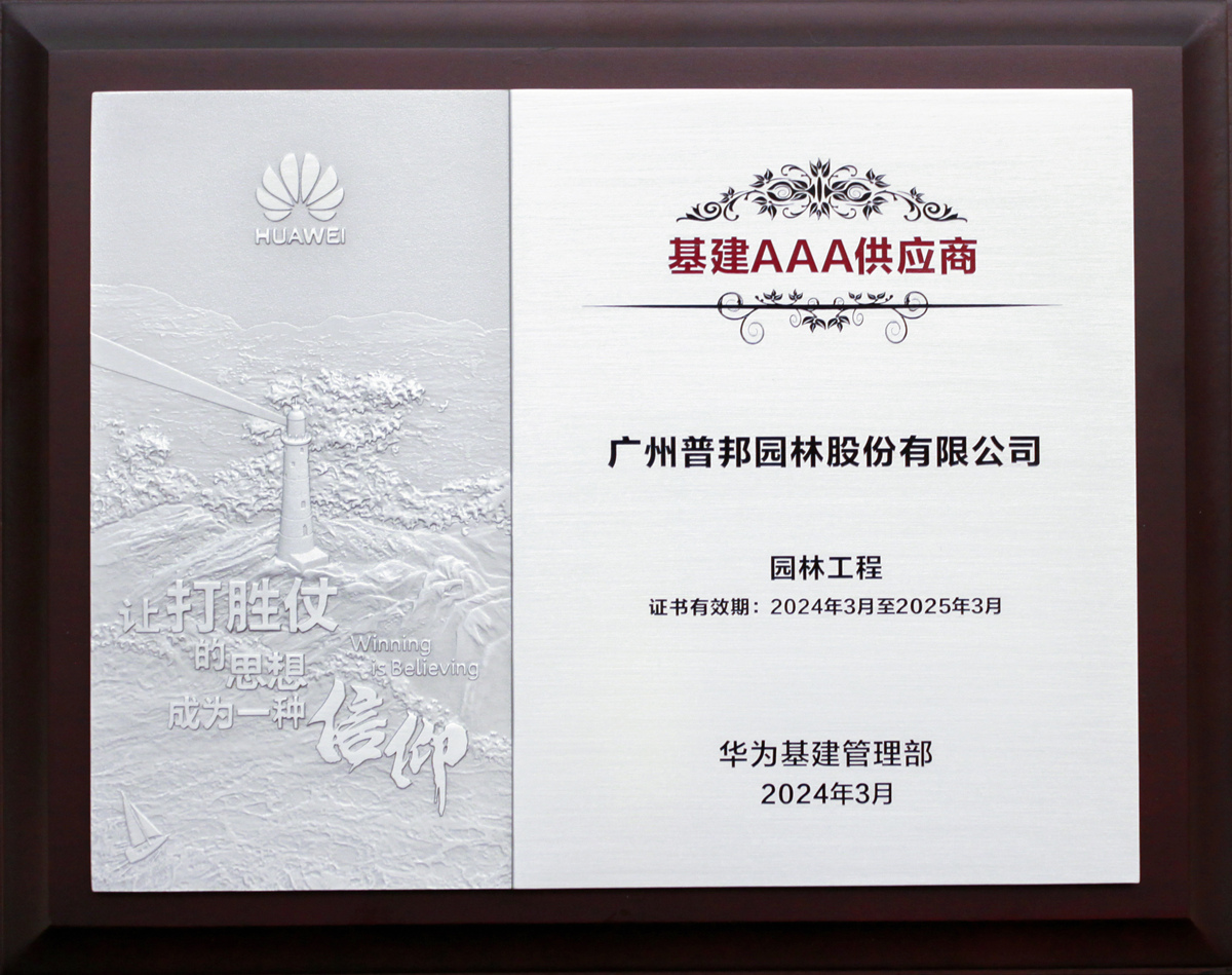 3月27日,华为基建AAA供应商颁奖大会在东莞松山湖召开。会上,我司荣获华为基建AAA供应商(园林工程),成为唯一入选且连续两年入选的园林工程专业单位。