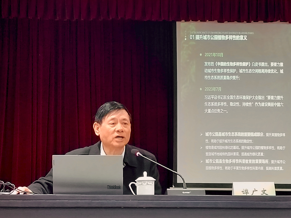 首席专家谭广文以“提升城市公园植物多样性的策略与方法”为主题,结合专业团队多年来对广州白云山风景名胜区、越秀公园以及兰圃的植物多样性研究,分析了城市公园绿地植物多样性的变化特点以及影响变化主要因素,重点剖析了越秀公园植物多样性相关的林木类型、优势植物、古树、古树后续资源和外来入侵植物等,并针对当前现状提出了提高城市公园生物多样性的管理策略与方法。